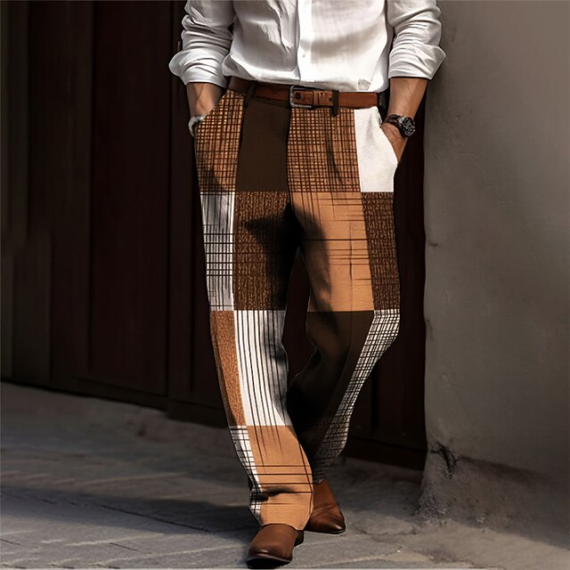 Highlights [Fabric]: Crafted from high-quality polyester, these men's trousers offer a blend of comfort and durability with a micro-elastic fit, ensuring ease of movement and wearability throughout the day. The fabric is designed to keep you feeling comfortable during the fall and winter seasons. [Fit]: Featuring a regular fit and high waistline, these trousers provide a modern and sleek silhouette ideal for business settings and casual outings. The tailored design allows for a polished look without compromising on comfort. [Design Highlights]: These dress trousers stand out with their bold plaid and check pattern, enhanced by a striking 3D print that adds depth and visual interest to the classic design. The unique patchwork of blue, orange, and green hues creates a vibrant and fashionable statement. Complete with a classic waistband and belt loops, they offer an opportunity for accessorizing to elevate your style. [Occasions]: Perfect for street wear, business environments, and outdoor activities, these pants seamlessly transition from day to night. Whether you're heading to the office or enjoying a casual outing, they add a refined touch to any ensemble. [Size Range]: Available in a full range of sizes from S to 3XL, providing options for a variety of body types to ensure the perfect fit.