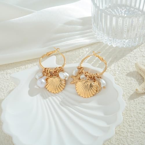 CLASSYZINT Gold Seashell Earings for Women Starfish Dangle Hoop Simulated Pearls Pendant Huggie Hoops Detachable Ocean Theme Earrings 5