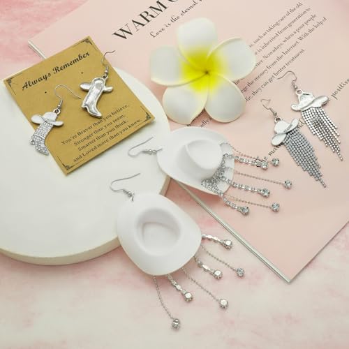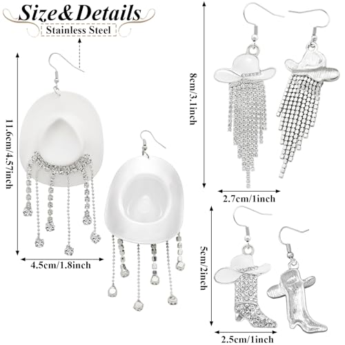 RechicGu 3 Pairs Western Cowgirl Cowboy Hat Earrings Set Silver Symmetric Boots Sparkly Rhinestone Tassels Drop Dangle Rural Culture Earrings Set For Women