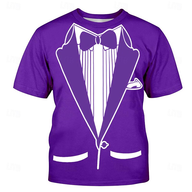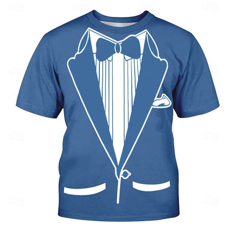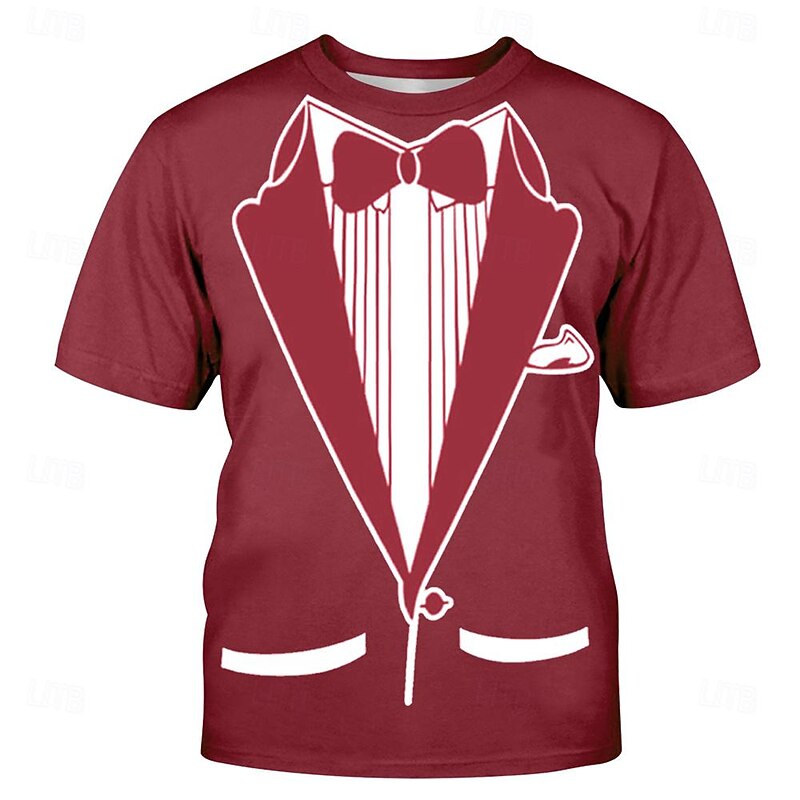: This T-shirt stands out with its fun, trompe-l'œil graphic that humorously mimics a formal tuxedo, complete with bowtie and tuxedo jacket details. The design merges vintage flair with a witty twist, adding a playful yet sophisticated element to your wardrobe.