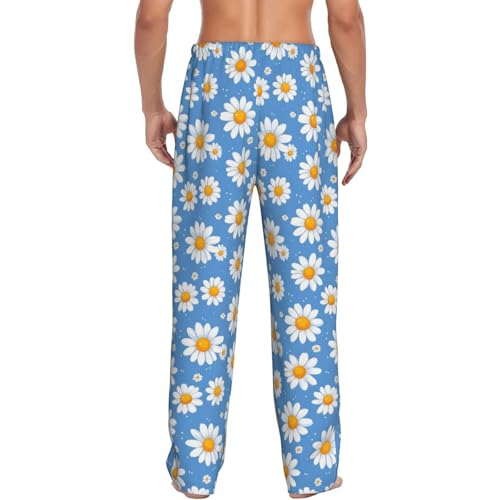 Mens Pajama Pants - Bright Daisy White Print silky Sleep Lounge Pants For Men, Casual Pj Bottoms With Pockets