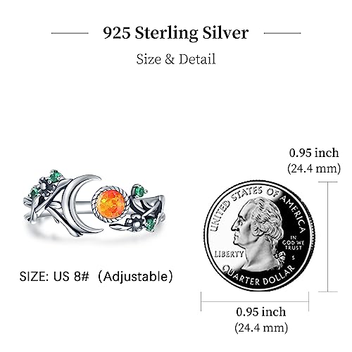 Ring size: AdjustableMaterial: Sterling SilverMetal type: Sterling SilverGem type: Opal๐Adorable Moon Rings: The ring combines crescent moon and sun with opal.The moon reflects the sun's light, illuminating the night of life and vitality.In the moonlight, the surrounding leaves come alive, as if infused with magic.๐Sun and Moon Jewelry quality: Made of high-quality 925 Sterling Silver material and fire opal.The fire opal gem symbolises passion and love not only for others, but for different elements of life. The Mexican fire opal has many positive attributes to bring to the life of its wearer.๐Leaf Moon Gift for Her: The beautiful ring of the moon can bring you healing, like the leaves of life, constantly reborn and shining.which form a powerful and eye-catching charm. Our jewelry comes in a beautiful box which makes it a unique gift to your loved ones.such as your grandmother, girlfriend, couples, mom, sister, daughter.โOpal Ring Adjustable Size: moon rings are adjustable rings that can be adjusted 5-11 inches, Our silver moon ring can be worn as a thumb ring or on any finger. Our fashion initial ring is nickel-free, lead-free, cadmium-free, allergy safe to the skin, and does not break, not fade easily.๐925 Sterling Silver Ring Gift: 100% refund if the product does not meet your expectations, if you have any questions about your purchase,Contact us through the Amazon messaging system, and we will be happy to assist you. Customers with a 100% peace of mind that their cherished jewelry are safe is what we strive for!