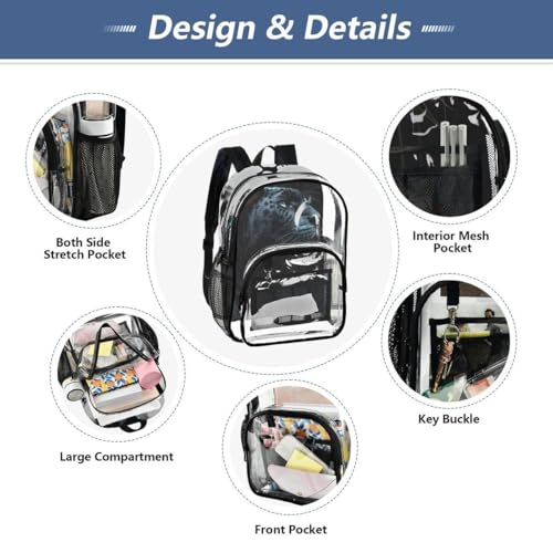 Material: This clear backpack is made of polyester fiber and PVC, with printed designs on both the inside and outside of the back, as well as on the shoulder straps. Unlike fully transparent backpacks, the style is more innovative and fashionable,Manufacturer's recommended age: over 3 years oldLarge Capacity: 10.6 X 7 X 15.7 inches, capacity: 19L. This clear bookbag can accommodate everything you need for college and work.Travel Daypack Structure: 1 main pocket+1 front patch pocket (zipper with keychain)+2 mesh insert pockets. The main bag can hold books and laptops; The front zipper pocket can hold some small items; The keychain can hold small items such as keys, and the pockets on both sides can hold a kettle or umbrellaPerspective Design: The transparent backpack is convenient for safety inspection, quick inspection and retrieval, as it meets the policy requirements for transparent bags. It is also very suitable for travel, airports, and correctional facilities.Ideal Choice: Our backpack print pattern is exquisite and elegant, making it very eye-catching when carrying it to school, work, outings, shopping, and travel. This is the impeccable gift for birthdays, anniversaries, or returning to school for children, friends, or family Perfect for everyday use. supreme materials and excellent craftsmanship ensure long-lasting durability.