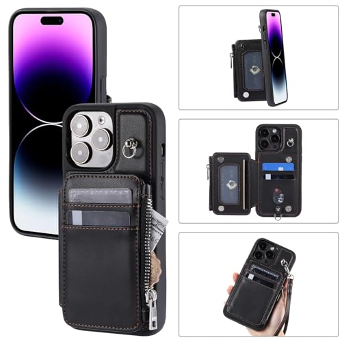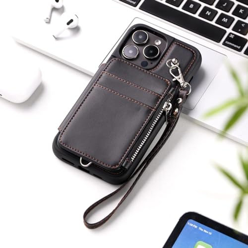 Wallet Case for iPhone 15 Pro Max/15 Plus/15 Pro/15, RFID Blocking Card Case with Wrist Strap, Zipper Leather Handbag (Color : Black, Size : 15Plus)