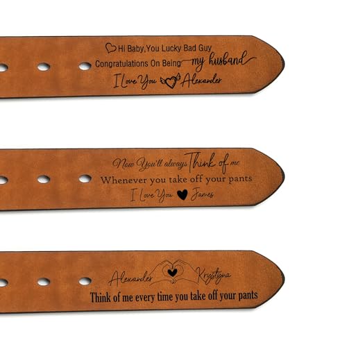 Fabric type: Cowhide LeatherCare instructions: Dry Cloth CleanOrigin: ImportedPersonalized Belt:The inside of the belt can be engraved with a name/date/meaningful message, you can choose from: 1: You Lucky Bad Guy, Congratulations On Being My Husband,Think of me every time you take off your pants,I love you.2: Now You'll always think of me,whenever you take off your pants.3: Custom text. Personalized belt is a unique and special gift, he will be surprisedMaterial:Blireana belts are made of high quality cowhide, flexible, strong and Long-lasting, can be used for many years. The belt buckle is made of zinc alloy, high brightness, wear-resistant and scratch-resistantVarious sizes for your choice:Belt Width: 1.49/3.8cm.Thickness: 0.157/0.4cm.Belt length: 41.34/105cm, 43.30/110cm, 45.28/115cm, 47.24/120cm, 49.21/125cm, 51.18/130cm, 55.12/140cm, 59.05/150cm, 62.99/160cm,66.93/170cm, suitable for waist size: 31.50---61.02. The belt length can be cut to meet different men's needsApplicable Scenario:This customized classic handmade belt is very suitable for suit pants, casual pants, business pants, jeans, camouflage pants, harem pants, ripped pants, etc., make your outfit more colorfulWish Gift:Beautifully packaged in a gift box, the personalized belt is an wish gift for yourself, husband, father, son, grandfather, lover, boyfriend, partner, brother, friend, man, doctor, groom, lawyer, colleague. Suitable for all kinds of holiday gifts: Valentine's Day, Father's Day, wedding anniversary, birthday, Christmas, graduation season, best man gift, New Year, Halloween, etc..