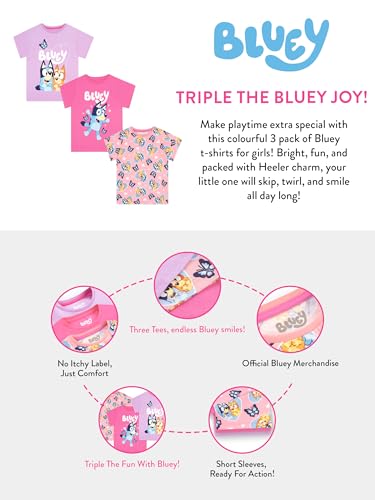 • Three Fun Bluey Designs: This Bluey Girls 3 pack t shirts features three delightful designs, perfect for Bluey fans! A purple Bluey tshirt with a fun placement print of Bluey and Bingo bringing their adventures to life. A light pink kids tshirt showcases a sweet repeating heart pattern of Bluey and Bingo, while the neon other Bluey girls t shirt shines with Bluey surrounded by colourful butterflies and hearts